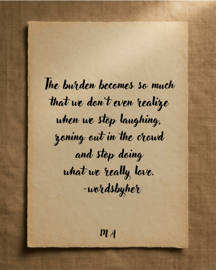 Why does every responsibility need to be a burden? As we learn to take responsibility, why does it keep increasing slowly, and why does every person need to make us aware of how little we are doing? Why can’t anyone see how hard we are trying every single day, every single minute? The burden becomes so much that we don’t even realise when we stop laughing, zoning out in the crowd and stop doing what we really love. Then I ask myself the question, who is going to save me? And the instant answer that I get is myself. My courage and my abilities to know my capabilities. As an adult, I know that I should keep myself as the biggest priority, and I should take care of myself. The day we start thinking for ourselves and saying no, which is necessary, everything will change, but for ourselves, everything will get better. What we like, what we love to do, what we want to be in the future, all of these questions are answered by ourselves only. There is no one to share the burden, and I don’t think we need anyone. It’s life, it is going to be full of responsibilities; however, when it starts to suffocate you, it’s time to take action and think for yourself. Keeping boundaries while choosing yourself is very important and healthy. I feel like the world doesn’t allow a person to live their life but to care for others, but that’s not right. Aren’t we supposed to live the life that is given to us? So just focus on yourself and don’t let the responsibilities of others ruin your life. Speak up for yourself and do it because you want it, not because others expect from you. Others will go; they will live their life while putting responsibility on you. But you have to speak up for yourself, don’t allow others to control your life. You live once, so live it to the fullest.