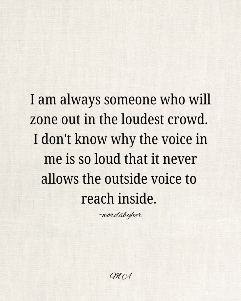 As I grew older, I realised that there is noise even in quietness. The more I grew up, the more I started liking being alone. In my childhood, I used to believe that being alone was not good at all; however, now I like to spend my time with myself the most. No matter how much social battery I have, I will always need time for myself. It’s actually a privilege to be able to love and understand yourself, and that only happens when we spend time with our thoughts. There is always a voice in quietness, the voice of our inner self that guides us on what and how to do. You can only love others if you start with yourself, and for that, you need to understand what happens in the quietness. I am always someone who will zone out in the loudest crowd. I don’t know why the voice in me is so loud that it never allows the outside voice to reach inside. We can see it as a metaphor too. It’s all in us; if we want to achieve something, we need to trust ourselves and just do it. Don’t let the outside voice take away your inner voice. You can be as loud to yourselves about things that you want in your life. You need to understand that there is a voice in your heart that knows you better than anyone, that stands with you when the world points at you, and that voice is trust and belief. There is so much you can find in quietness, even yourself. It’s mandatory to look after yourself, to be selfish for yourself, to find the voice that describes just you. In quietness, you find yourself, and you start seeing yourself the way you want rather than from the world’s point of view. So being in peace, in quietness, is a way to listen to the inner voice that best describes you.