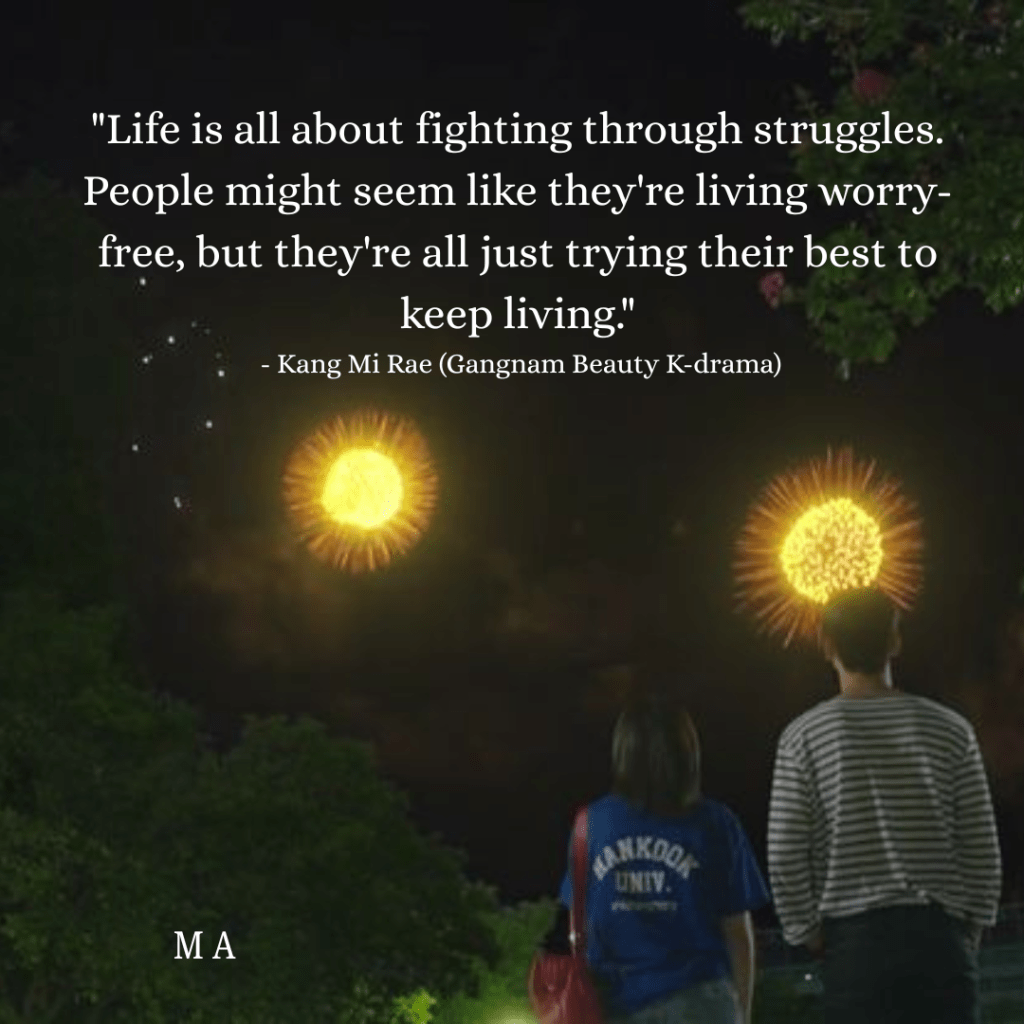 “Why do we have to be like this? We judge faces…We throw up and have surgeries…as if we’d die if we didn’t get pretty. Why do we have to do that? From now on, I will concentrate on what makes me really happy.” – Kang Mi Rae.